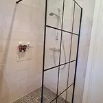 Bathroom facilities also include a roll-in shower and a separate toilet. A hair dryer and towels are included for added comfort.